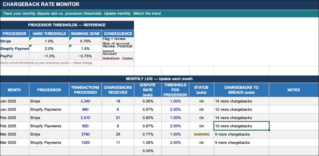 - Dispute Response Tracker — tracks deadlines, evidence status, and outcomes. Monitors your chargeback rate against processor thresholds.